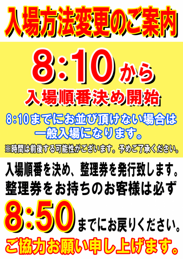 8:40より入場順番決め。8:50より再整列。9:00より入場。 |
