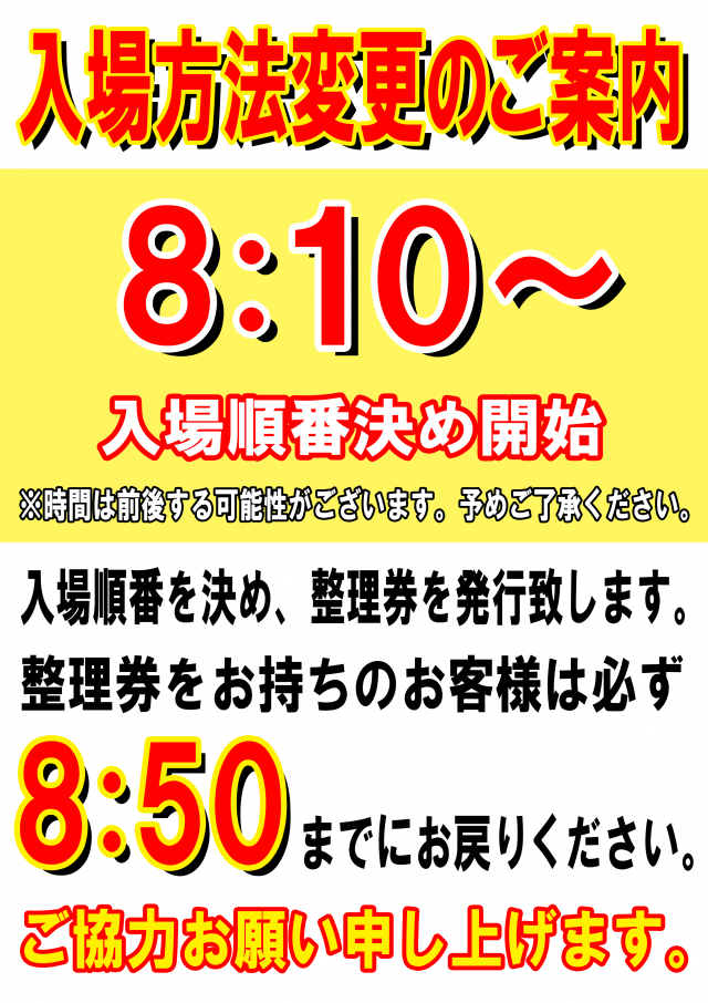 8:40より入場順番決め。8:50より再整列。9:00より入場。 |