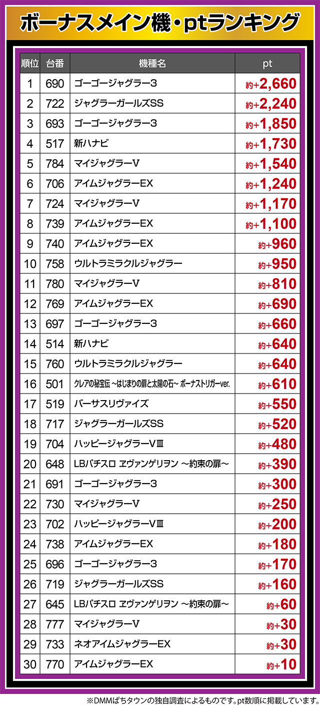 690番台は約+2,660pt、693番台も約+1,850ptと、多くの台がプラスとなった。