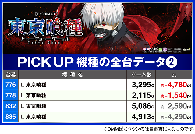 2台が約+1,500ptを超えた「L 東京喰種」では、776番台が約+4,700ptを上回った。