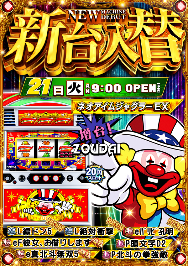本日!新台入替3日目!新台でお楽しみください!🌟🌟🌟
