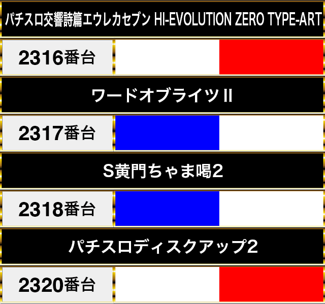 華やかな光景は、『パチスロ交響詩篇エウレカセブン HI-EVOLUTION ZERO TYPE-ART』の2316番台から『パチスロディスクアップ2』の2320番台までにも広がっていた。