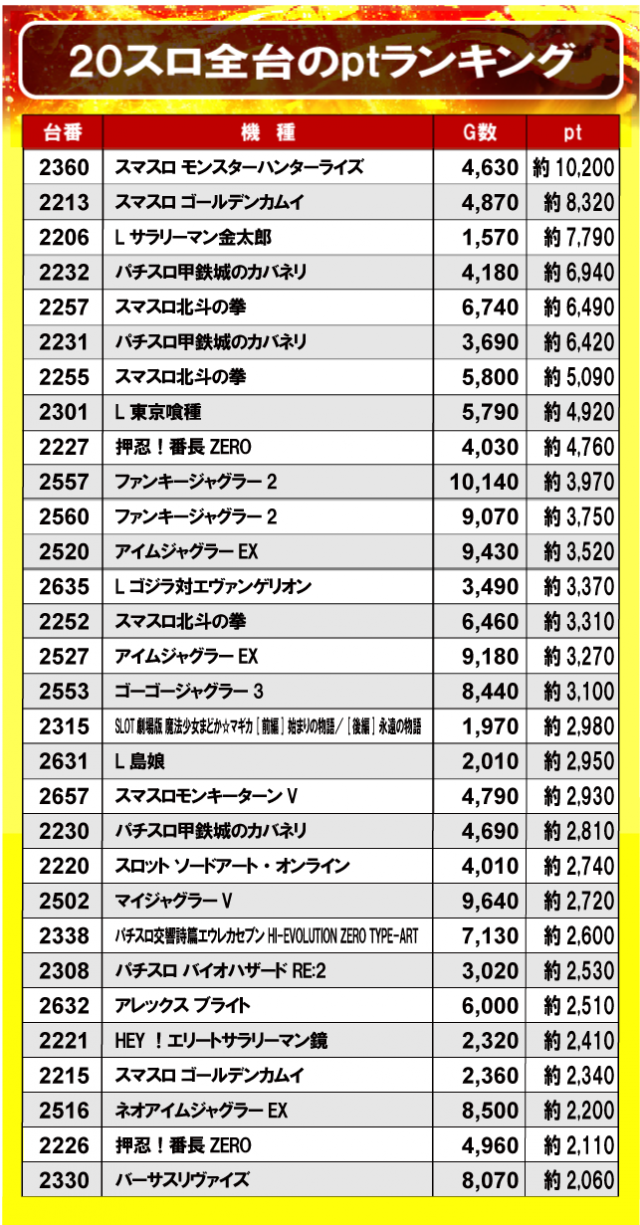 『スマスロ モンスターハンターライズ』が約10,200ptを叩き出しランキングトップに!次点で『スマスロ ゴールデンカムイ』が約8,320pt、『L サラリーマン金太郎』が約7,790ptを獲得し、打ち応え十分の好成績をマークした。ランキング全体を見渡すと、AT機からノーマルタイプまで幅広い機種が存在感を発揮!各台で熱い展開が繰り広げられ、フロア全体の盛り上がりを強く印象づける内容となっていた。