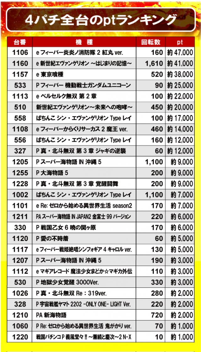 今回、パチンココーナーでトップを飾ったのが『eフィーバー炎炎ノ消防隊2 紅丸ver.』で、約47,000ptを獲得!続く『e 新世紀エヴァンゲリオン 〜はじまりの記憶〜』も約41,000ptという好成績を叩き出し、その実力を証明した。そのほかの機種からもまとまったptが確認され、各所でチャンスを感じさせる光景が広がっていた!