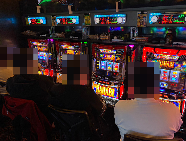 パチスロの状況をうかがうと、『新ハナビ』に笑顔のプレイヤーが並んでいた。