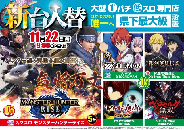 11月22日(金)★低スロなのに最新台が!モンハン5台導入★