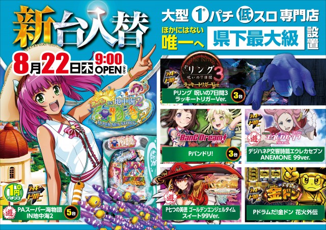 8月22日(木)★大型1パチ低スロ専門店の圧倒的新台入替★