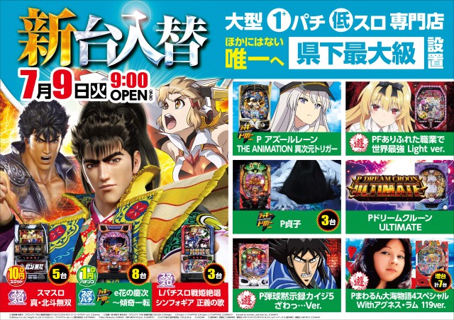 明日7月9日 ★1パチ低スロ専門店が最新台をドドーンと導入★