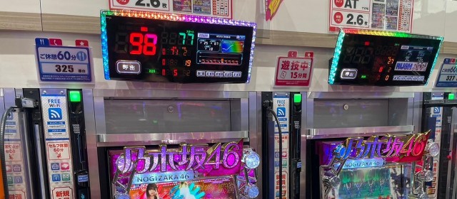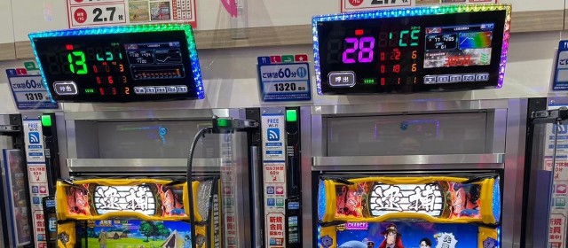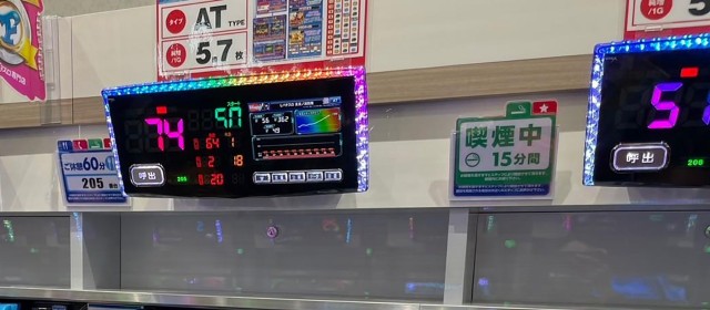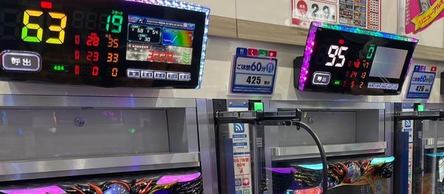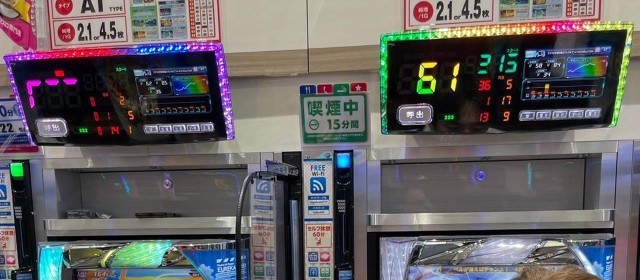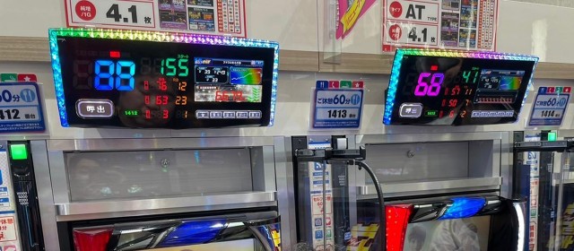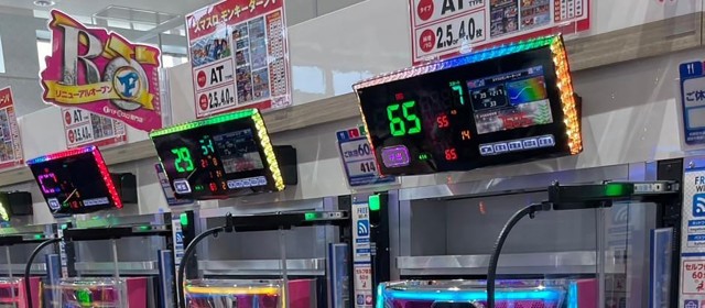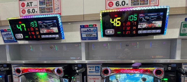 冒頭の写真で挙げた『Lパチスロ炎炎ノ消防隊』『スマスロ交響詩篇エウレカセブン4 HI-EVOLUTION』を代表格に『スマスロ北斗の拳』『パチスロ からくりサーカス』『スマスロバジリスク~甲賀忍法帖~絆2 天膳 BLACK EDITION』など、台上カウンターにはレインボーの表示が続出。この日の好況を物語っていた。
