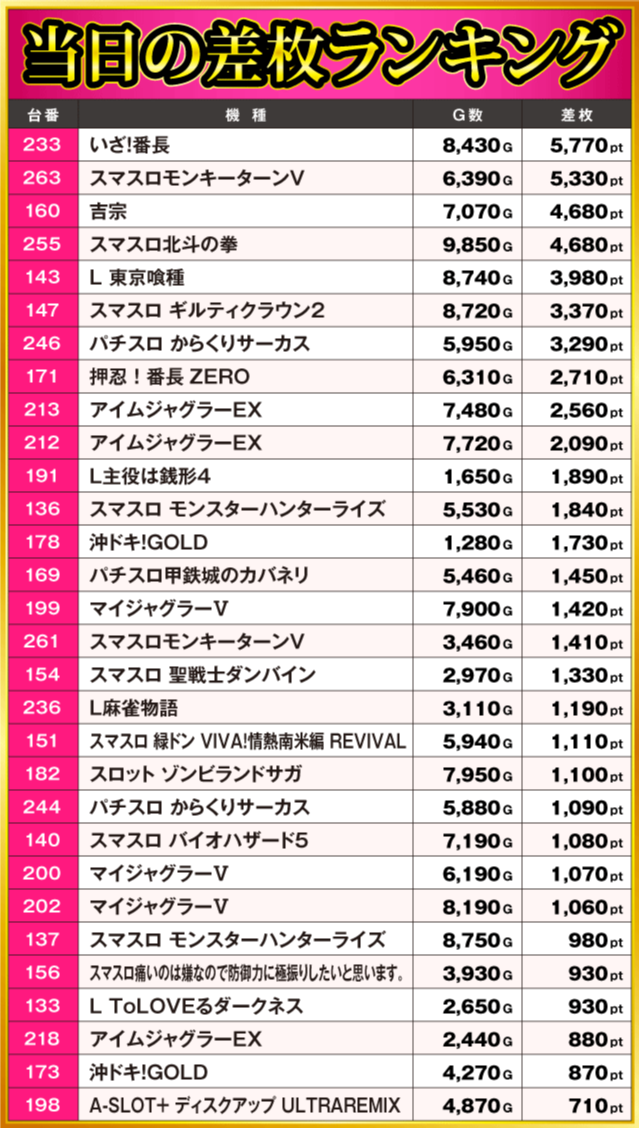 この日、最もプレイヤーの注目を集めていたのが導入直後の新台『いざ!番長』で、233番台が+5,770ptを記録しランキングトップに。次いで『スマスロモンキーターンV』から+5,330pt、『吉宗』と『スマスロ北斗の拳』から+4,000pt超が飛び出し店内を盛り上げていた。