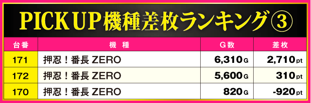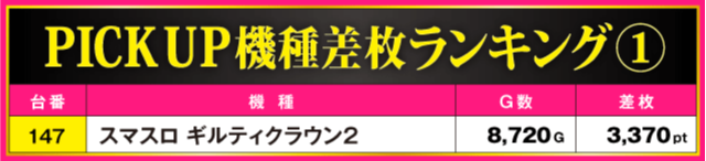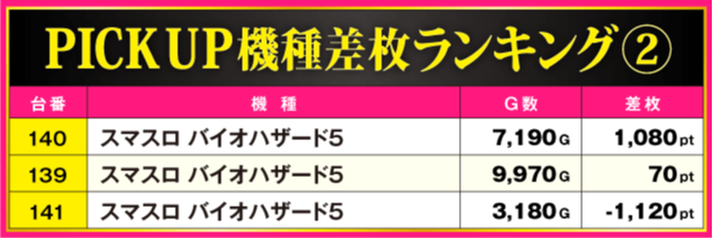 次にPICK UP機種の状況を見ていこう。『スマスロ ギルティクラウン2』から+3,370pt、『押忍!番長ZERO』からは+2,710ptを確認。また、『スマスロ バイオハザード5』は全3台中2台がプラス差枚となっている。