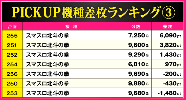 次にPICK UP機種の状況をチェック!! ランキングを制した『パチスロ 革命機ヴァルヴレイヴ』以外にも多数の好調台が確認されており、『L 東京喰種』から+7,850pt、『スマスロ北斗の拳』からは+6,090ptが発生。しかも、3機種トータルの全11台中8台がプラス差枚となっているだけに、ファンにとって充実の一日となったのは間違いないだろう。