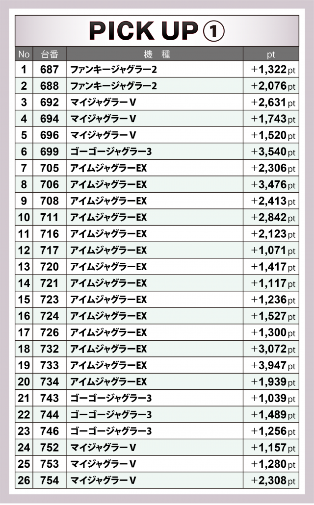 ジャグラー4つでは前回・前々回の19台を上回る26台が1,000overをマーク。今回も『アイムジャグラーEX』が最も多く好調台を輩出。またどの機種でも2・3台と隣り合っての好況が見受けられた。