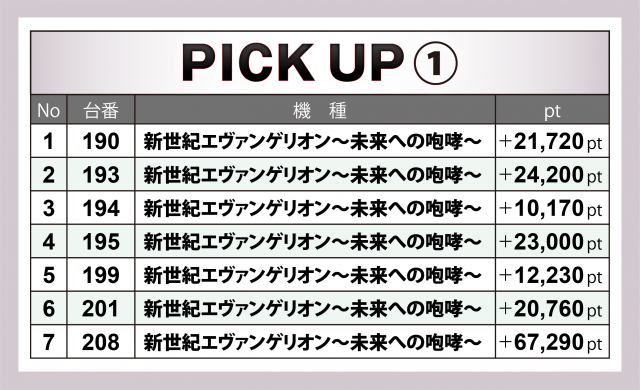 同店と最多設置となる32台の『新世紀エヴァンゲリオン~未来への咆哮~』では208番台が+6万7千超のビッグヒット! さらに4台が+2万オーバーを果たし、シマはドル箱の山で溢れた。