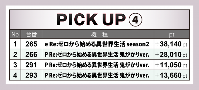 最後は4パチに視線を移し、5桁の差玉となった台をピックアップする。前回と同じくエヴァ・海物語・リゼロと、3つのシリーズに迫る。