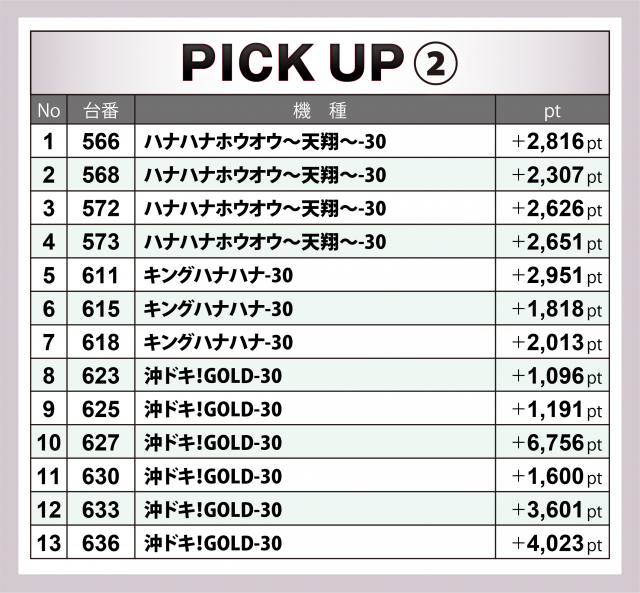 沖スロも前回より2台増した13台が4桁プラスを達成。『沖ドキ!GOLD-30』では627番台が+6千8百弱を記録、その他にも+4千超&+3千超が1台ずつと、ハイクラスにあった。