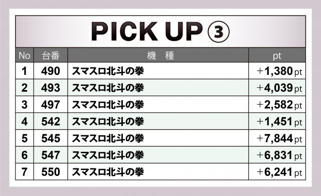 『スマスロ北斗』24台では7台が1,000overを成立。前回のMAXは+6千超だったが、今回は545番台が+7千8百超を叩き出し、その他にも+6千オーバーが2台と、大きな盛り上がりとなった。