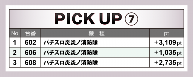 『パチスロ炎炎ノ消防隊』7台では4台がプラス、3台が4桁の差枚数を残し、2台が+3千クラスとなった。