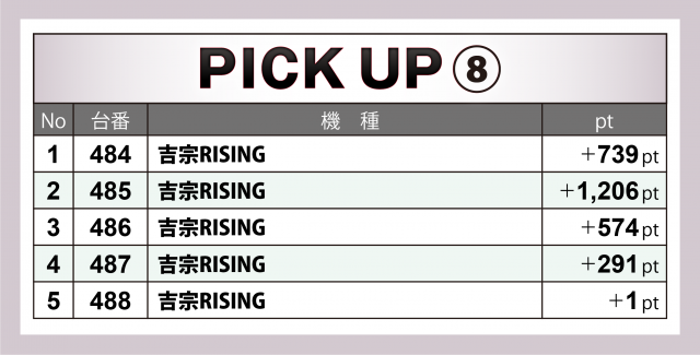 突出した枚数の台はなかったが見逃せないのが『吉宗RISING』5台。全台が勝利となった。