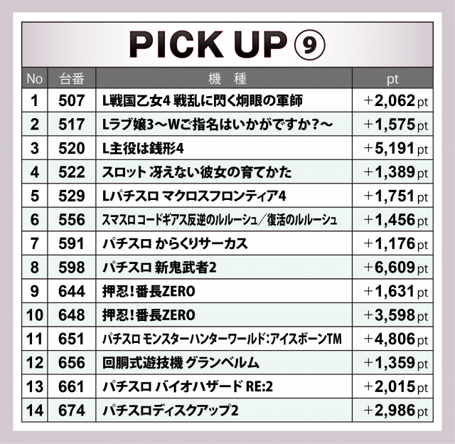 さらに少設置機種にも数々高い数値の台が生じ、『パチスロ 新鬼武者2』の+6千6百超・『L主役は銭形4』の+5千2百弱・『パチスロ モンスターハンターワールド:アイスボーンTM』の+4千8百超など、至る所に勝機が秘められていたことが分かる。