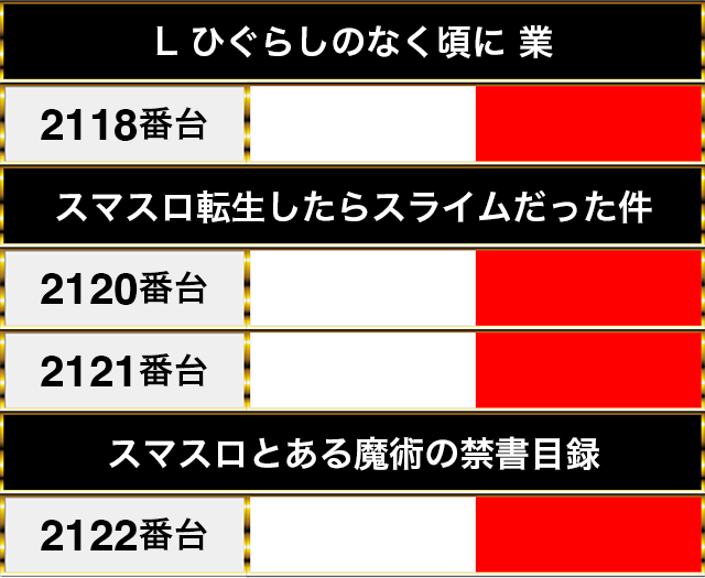 『L ひぐらしのなく頃に 業』の2118番台から『スマスロとある魔術の禁書目録』の2122番台までも4台が連なってプラスpt!