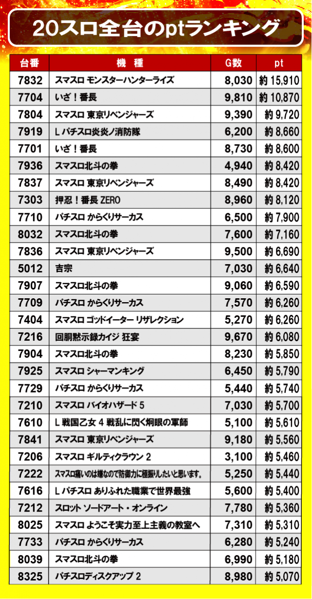①20スロ全台のptランキング
