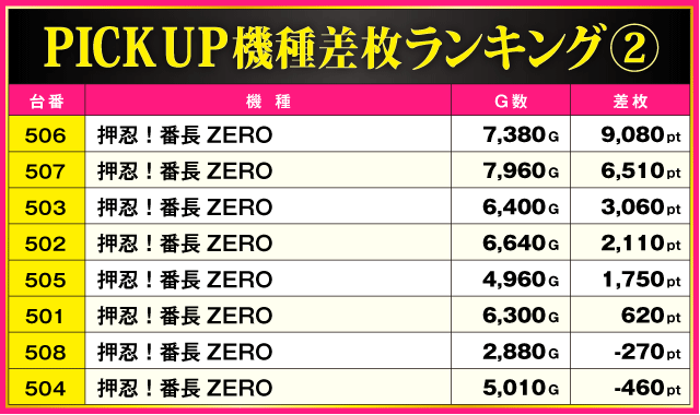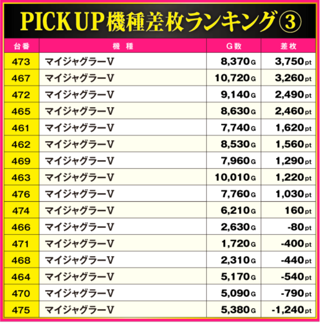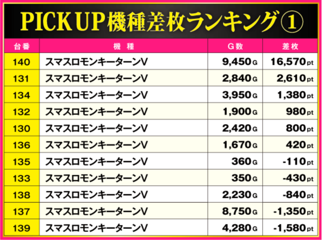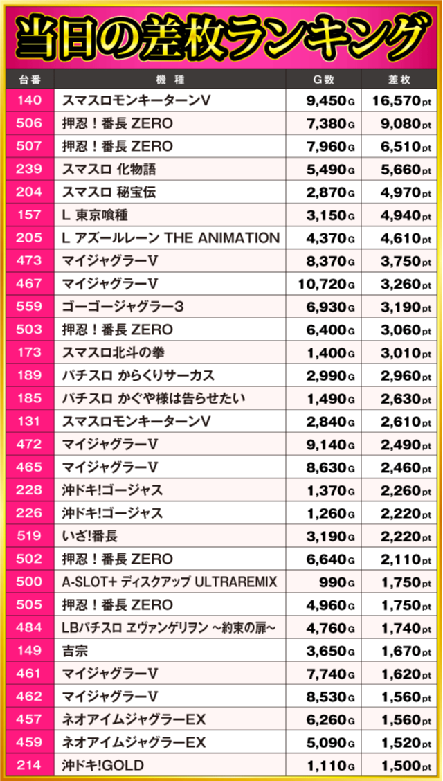この日は、未だ人気の衰え知らずな大ヒット機種『スマスロモンキーターンV』が怒涛の+16,570ptを叩き出し堂々のランキングトップに輝いた。次いで『押忍!番長ZERO』が+9,080ptに+6,510ptと好成績を連発。さらに、ジャグラーシリーズも奮闘しており、差枚TOP30に9台がランクインしている。