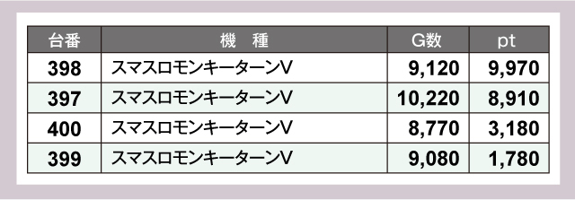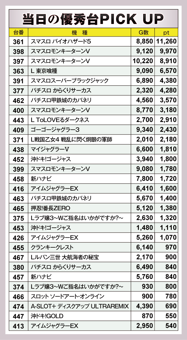 この日のヒーローは『スマスロ バイオハザード5』。361番台が+11,260ptと1万pt超を果たした。『スマスロモンキーターンV』も負けておらず398番台が+9,970pt、397番台が+8,910ptと見事な成績を残している。以下にも『L 東京喰種』363番台の+6,570pt、『スマスロスーパーブラックジャック』391番台の+4,380ptなどなど優秀台がズラリと並ぶ見事なデータとなった。