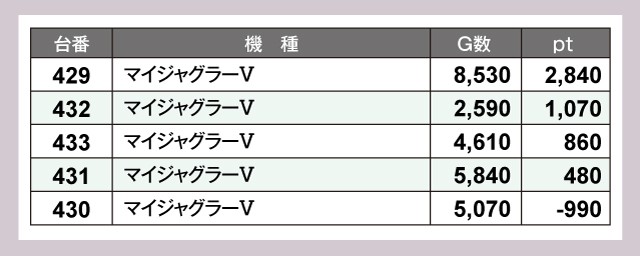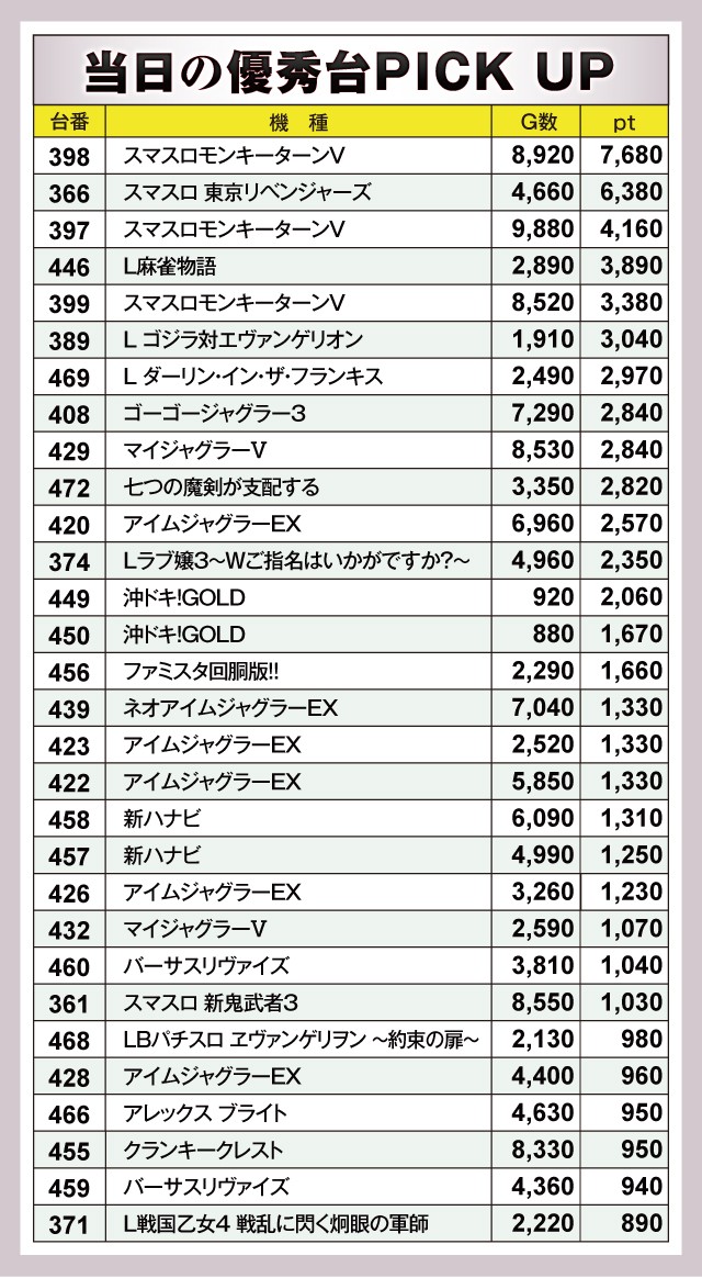 頭ひとつ飛びだしたのは『スマスロモンキーターンV』。398番台が+7,680ptと優秀な成績をのこしていた。そして『スマスロ 東京リベンジャーズ』366番台が+6,380pt、『L麻雀物語』446番台の+3,890ptなどなど、大幅プラスptの台が並ぶランキングとなっていた。