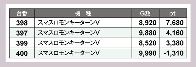 『スマスロモンキーターンV』は4台中3台がプラスpt。+3,000pt超が3台も誕生している。