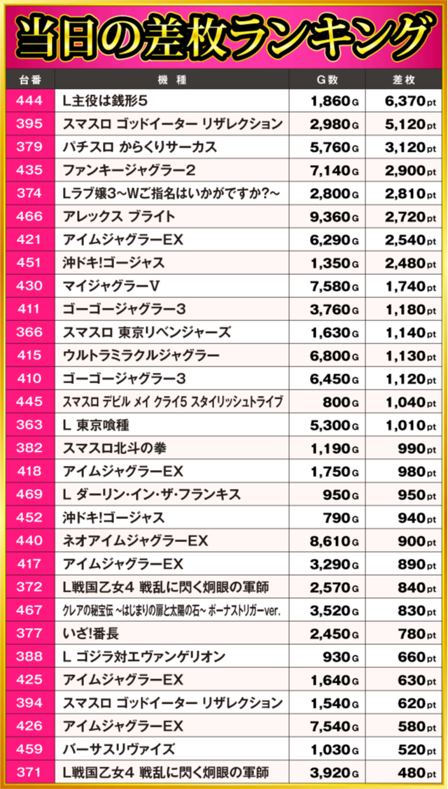 この日は、『L主役は銭形5』が+6,370ptを記録しランキングトップに。次いで『スマスロ ゴッドイーター リザレクション』から+5,120ptが飛び出し店内を盛り上げていた。また、ジャグラーシリーズも大奮闘しており、『ファンキージャグラー2』の+2,900ptを皮切りに差枚TOP30に11台がランクインする盛況ぶりを披露している。