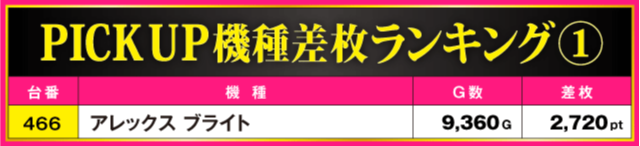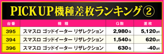 次にPICK UP機種の状況を見ていくと、差枚上位にランクインした台以外からも複数の好調台を確認。最終的に3機種トータルの全9台中6台がプラス差枚となる見事な結果を残しているだけに、ファンにとって充実の一日となったのは間違いないだろう。