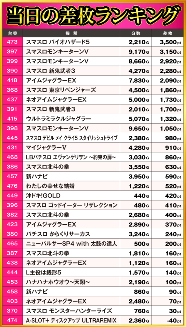 この日は、『スマスロ バイオハザード5』や『スマスロモンキーターンV』、『スマスロ 新鬼武者3』が差枚上位にランクインするなど、新旧を問わず様々な機種から好成績が飛び出している。さらに、ジャグラーシリーズも奮闘しており、差枚TOP30に7台がランクインする盛況ぶりを披露し店内を盛り上げていた。