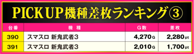 今回のPICK UP機種は差枚上位にランクインした3機種で、好成績を記録した台以外にも多数の好調台が確認されている。最終的に3機種トータルの全7台中6台がプラス差枚で実戦を終えているだけに、それぞれの機種のファンにとっては大満足の一日となったはずだ。