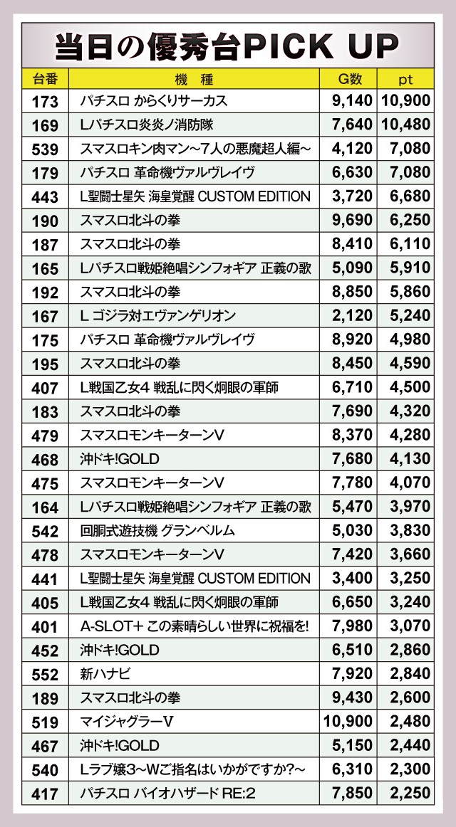それだけではない。『パチスロ からくりサーカス』も平均8,400G超えの高稼働に加え、173番台が+10,900ptと機種性能を最大限に引き出していた。