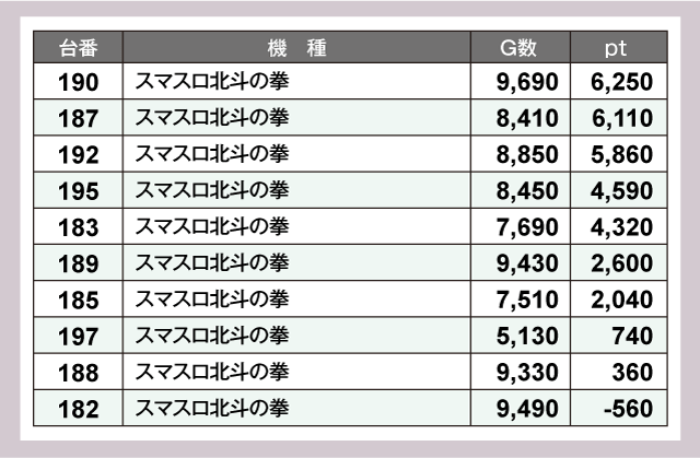 『スマスロ北斗の拳』はランキング上位30台中6台がランクイン。しかも17台中9台がプラス差枚と絶好調だったようだ。