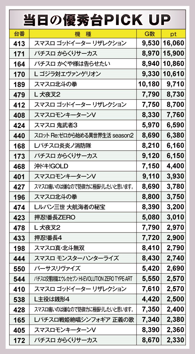 この日は413番台『スマスロ ゴッドイーター リザレクション』の+16,060ptをはじめ、171番台『パチスロ からくりサーカス』、164番台『パチスロ かぐや様は告らせたい』など至る所で1万ptオーバーの好調台が誕生し、多くのプレイヤーを楽しませていた。