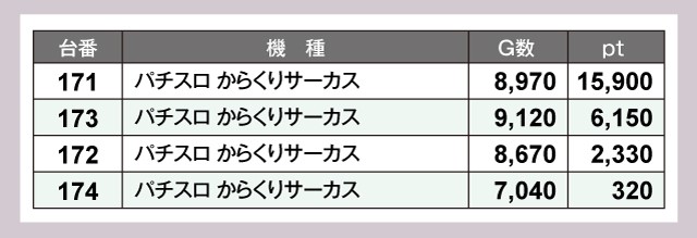 『パチスロ からくりサーカス』は4台すべてがプラスで終了。171番台はランキング2位の+15,900ptをたたき出していた。