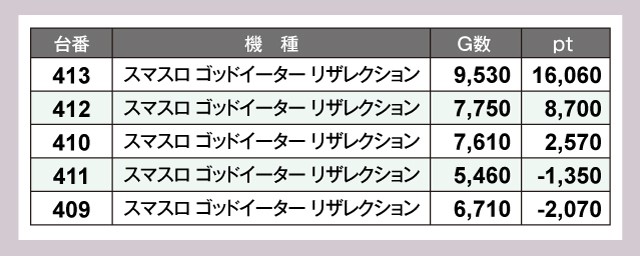ランキング1位にも輝いた『スマスロ ゴッドイーター リザレクション』では、413番台の+16,060ptに加え、412番台+8,700ptなど素晴らしい結果を残している。