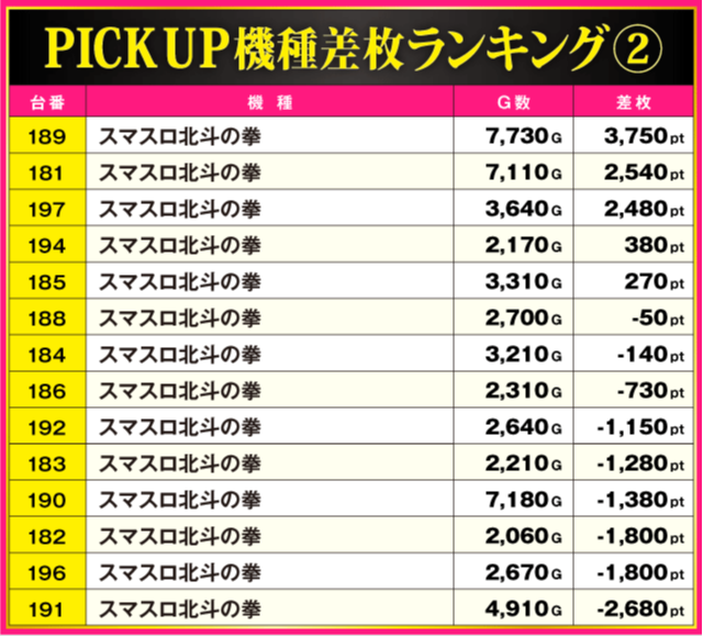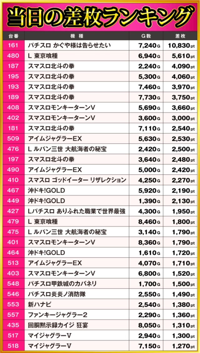 この日、最も目立っていたのが『パチスロ かぐや様は告らせたい』で、万枚超の+10,830ptが飛び出しランキングトップに輝いた。また、その他にも『L 東京喰種』や『スマスロ北斗の拳』といった人気のスマスロを中心に様々な機種からハイスコアが発生している。
