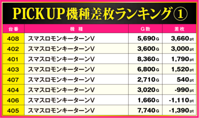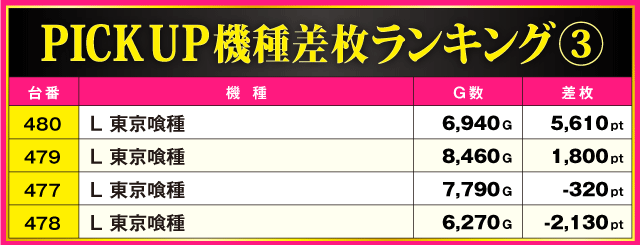次にPICK UP機種をチェックしていこう。『スマスロモンキーターンV』と『スマスロ北斗の拳』からは+3,000pt超を確認。そして、『L 東京喰種』は480番台の+5,610ptを筆頭に、全4台中2台がプラス差枚で終了するという見事な結果を残しファンを喜ばせていた。