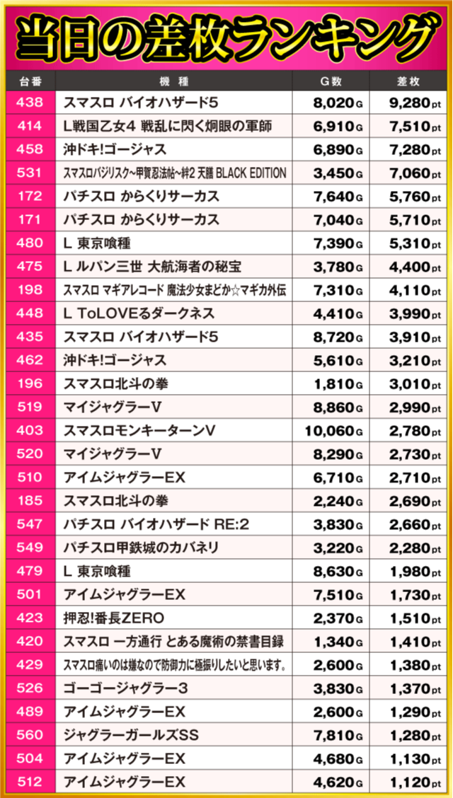 この日、最も目立っていたのが『スマスロ バイオハザード5』で、万枚目前の+9,280ptが飛び出しランキングトップに輝いた。また、その他の機種では『スマスロ マギアレコード 魔法少女まどか☆マギカ外伝』が+4,110ptを記録するなど、導入直後の新台も既存の機種に負けない奮闘ぶりを見せていた。