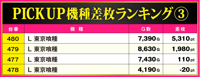 次にPICK UP機種をチェックしていこう。ランキングを制した『スマスロ バイオハザード5』は最終的に全4台中3台がプラス差枚に。『パチスロ からくりサーカス』と『L 東京喰種』は、それぞれから+5,000pt超のハイスコアが確認されている。