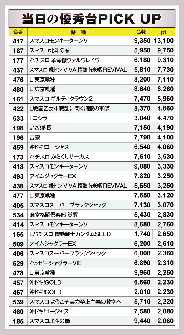 飛びぬけたのは『スマスロモンキーターンV』。417番台が+13,100ptと、見事に1万ptオーバーを達成している。ついで『スマスロ北斗の拳』187番台が+9,750pt、『パチスロ 革命機ヴァルヴレイヴ』177番台が+9,310ptとつづく。以下『スマスロ 緑ドン VIVA!情熱南米編 REVIVAL』437番台の+7,730ptなど、優秀台が並ぶ見応え満点のデータとなっていた。