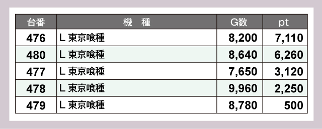 増台した『L 東京喰種』は全台がプラスpt。476番台の+7,110ptなど優秀台も多く、G数も高い水準で回されている。