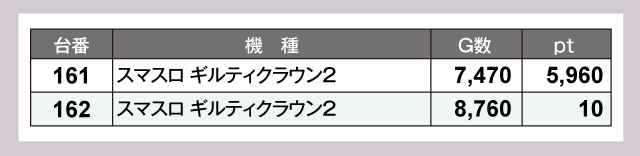 『スマスロ ギルティクラウン2』も設置されている2台がともにプラス。とくに161番台が大幅プラスptとなった。