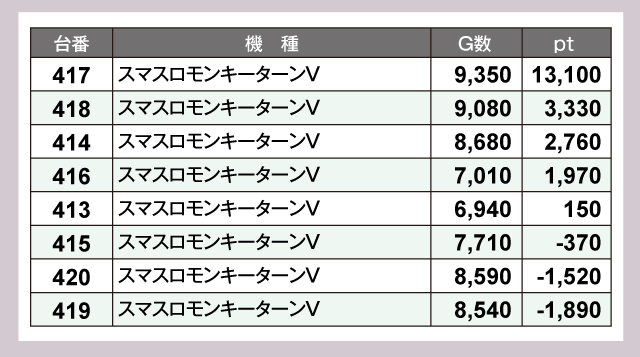 『スマスロモンキーターンV』は8台中5台がプラスで、1万ptを達成した417番台のほか、+3,330ptや+2,760ptなどが飛びだした。