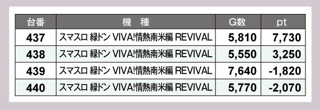 4台設置の『スマスロ 緑ドン VIVA!情熱南米編 REVIVAL』は半数がプラスptとなっていて、G数的にはまだまだ伸びしろがありそうだ。