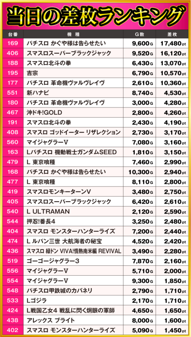 この日は、『パチスロ かぐや様は告らせたい』が怒涛の+17,480ptを叩き出しランキングトップに。また、『スマスロスーパーブラックジャック』が+16,120pt、『スマスロ北斗の拳』が+13,070ptを記録。さらに、『吉宗』と『パチスロ 革命機ヴァルヴレイヴ』も万枚超を達成するなど、差枚TOP5が実にハイレベルな結果を残している。