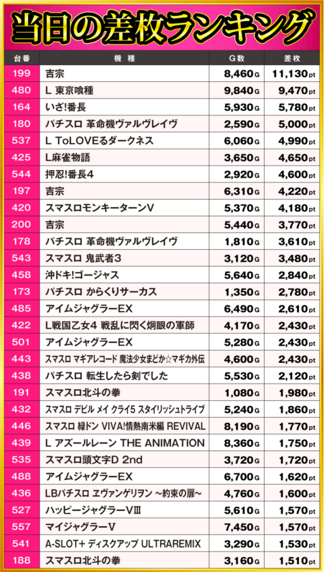 当日の差枚ランキング